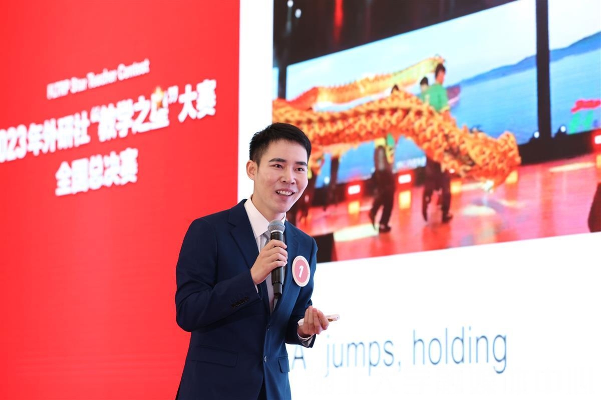 湖大团队选取《新标准大学英语(第三版)综合教程2》中的Sports for all为参赛单元。决赛现场,侯润和许洲依次上台进行教学设计介绍和课堂教学展示,再共同接受评委提问。“请选择合适的动词描述这个场景”,许洲正在向学生讲解如何进行准确生动的动作描写。他以一张湖大龙狮团表演的动图吸引了学生的目光。看到狮子起舞,舞姿矫健而娴熟,在场学生纷纷亮起眼睛,迫不及待地想要回答。