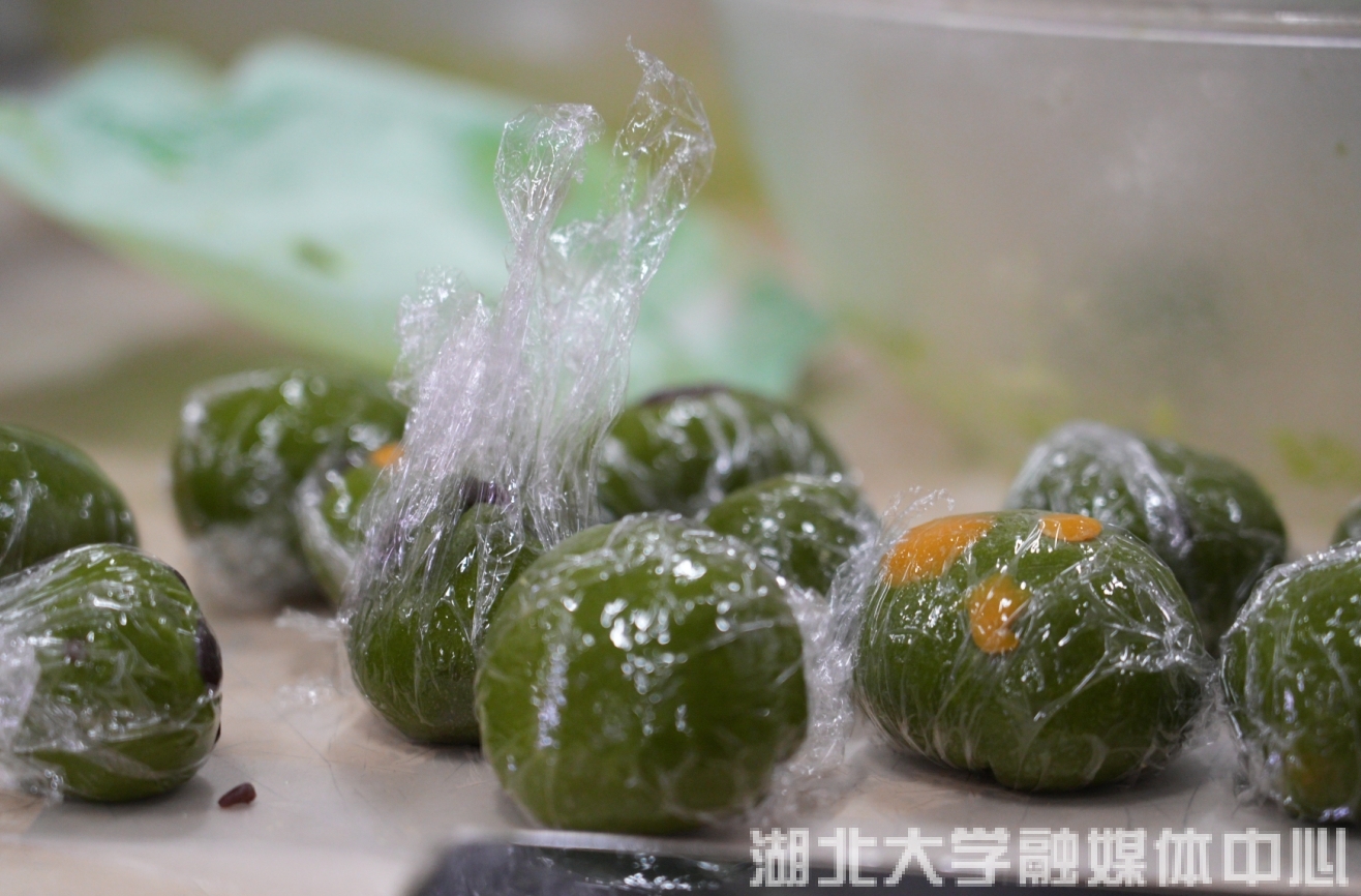 青团预拌粉倒入盆中、热水烫开揉成面团、包入不同搭配的馅料、轻轻捏合揉圆……学生们提前在线上预习过制作步骤,实战时做得有模有样,青翠圆润的青团一个接一个地出现在学生们的手中。