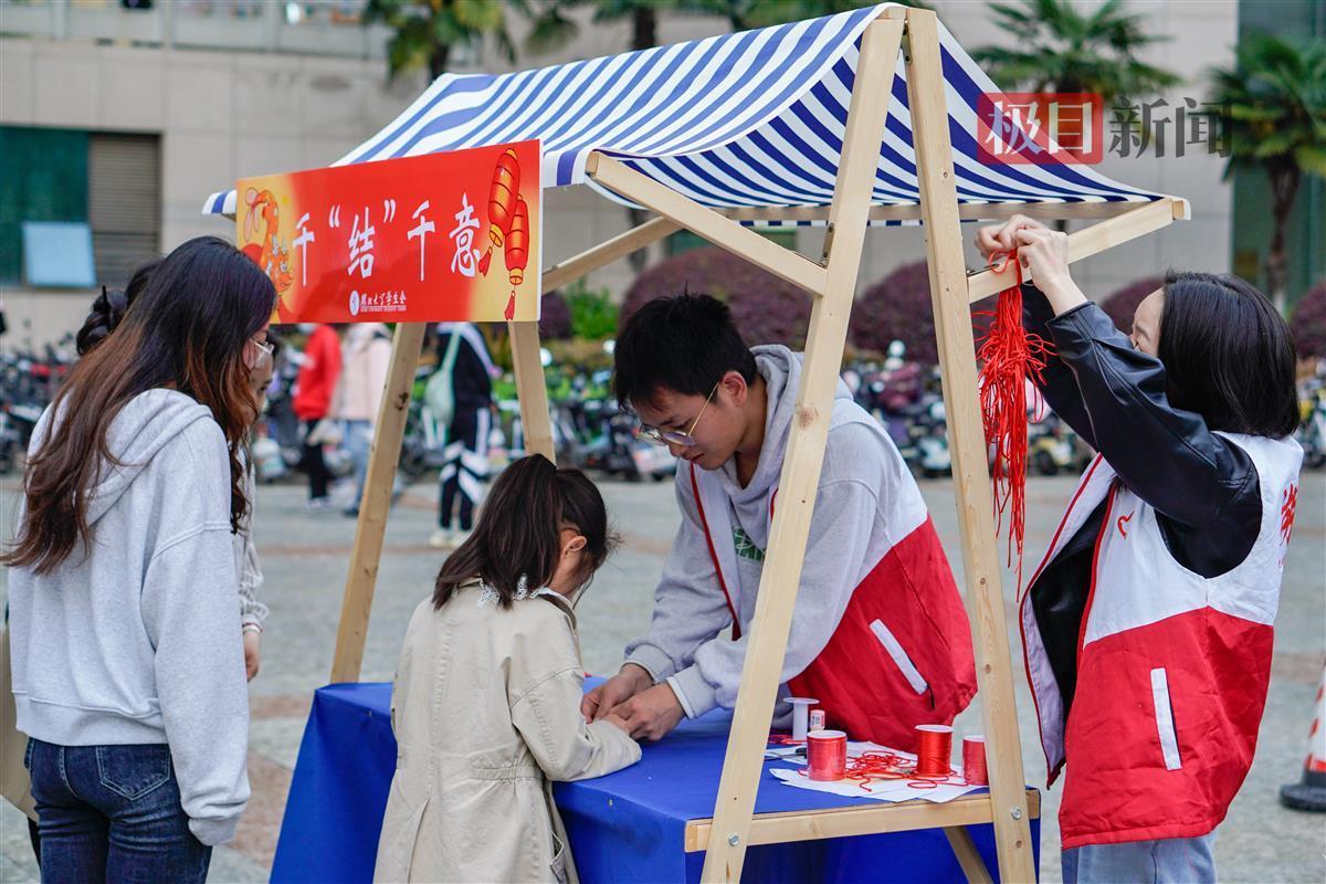 红线在指尖翻绕着,片刻,一个精致小巧的中国结就做好了。在“千结千意”的摊位前,围满了前来学做中国结的学生。2022级法学专业学生马骏哲已经在摊位前停留许久,却迟迟没有编出自己的中国结。“我真的不会编啊。”听到这句话,一旁的老奶奶停下手中的活,将自己原本系好的中国结解散,带着马骏哲一步一步缠绕红线。“先将红线对折形成一个圆圈,再将红线一头穿过圆圈,然后拉紧。”老奶奶说。几分钟后,两个中国结出现在大家眼前。马骏哲开心地说:“没想到参加活动还能学会编中国结。”学会编织中国结后,他开始教学周围的学生。梅花结、六耳团锦结、三回盘长结……根根红线在学生手中缠绕翻转着,被编织成不同的样子。