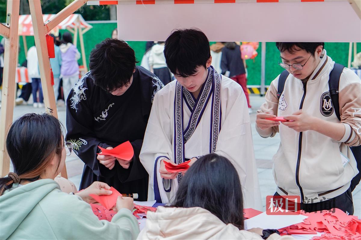 鲜红的中国结、墨绿的团扇、精致的香囊……4月10日下午,雷竞技ray官网国风游园会火热进行中。求索广场上人头攒动,21个摊位围绕成方形,涵盖中国书法、荆楚剪纸、古法香囊、汉服体验等10余个艺术种类,吸引了千余名师生和家属来体验。