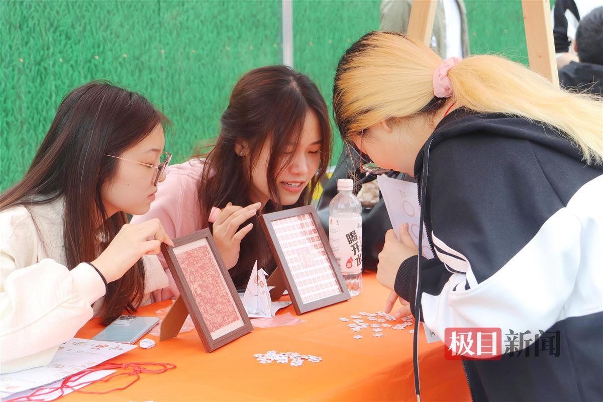 另一个高人气的摊位则是“剪韵流芳”。摊位上准备了若干红纸和数把剪刀,摊位前围满了跃跃欲试的学生,摊位负责人学生马骏飞告诉记者,剪纸是中国传统非物质文化遗产,为了让学生们能体验此项目,他们提前准备了许多教程,由难到易,各有涉及。“即使达不到古法剪纸的水准,也可以借此机会鼓励大家多多了解优秀的文化遗产”,马骏飞介绍,学生们都很享受剪纸的过程,咔嚓的清脆声响间,桌上已堆满剪纸作品,“还好我们的物资充足,不然一会儿就要用完了”。