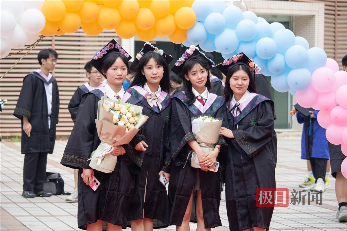 戴着亲手制作的簪花学士帽,穿越气球拱门,400余位毕业生们意气风发,走过40米的长红毯,取下属于自己的一枝鲜花,留下在学校最后的签名。