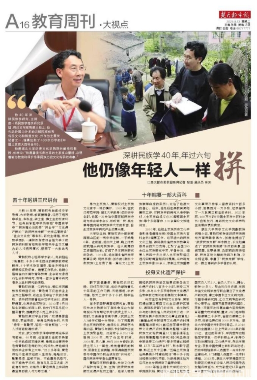他40年深耕民族学研究,主持数十项民族学相关研究项目,将论文写在荆楚大地上;他先后赴国内外多地讲解民族优秀传统文化和荆楚文化,并作为主要发起者之一,编纂出版了400余万字的《中国土家族大百科全书》。